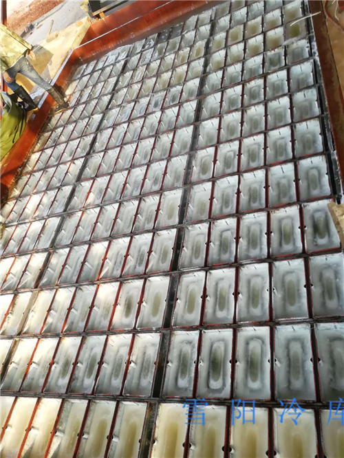 鹽水制冰屬于間接冷卻系統(tǒng)。傳統(tǒng)做法的鹽水制冰池中,蒸發(fā)器鹽水池和制冰鹽水池合二為一個制冰池,并用隔板將兩者隔開,利用鹽水?dāng)嚢杵魇果}水在兩個鹽水池中循環(huán),冰桶放在制冰鹽水池中。鹽水在蒸發(fā)器鹽水池中被降溫后,在攪拌器的作用下進(jìn)入制冰鹽水池對冰桶降溫,溫度升高后的鹽水由另一側(cè)流入蒸發(fā)器鹽水池再行冷卻。在鹽水制冰設(shè)備匯總,制冷劑在蒸發(fā)器內(nèi)吸收鹽水的熱量,使鹽水降溫并保持在-10~-14℃左右。當(dāng)冰桶中的水被凍結(jié)后,由吊車依次將冰桶組吊出制冰池放進(jìn)融冰槽融冰,而后利用倒冰架脫水,并經(jīng)滑冰道進(jìn)入冰庫儲存或直接運走。脫水后的空冰桶經(jīng)注水后再放入制冰池中繼續(xù)生產(chǎn),如此循環(huán)。